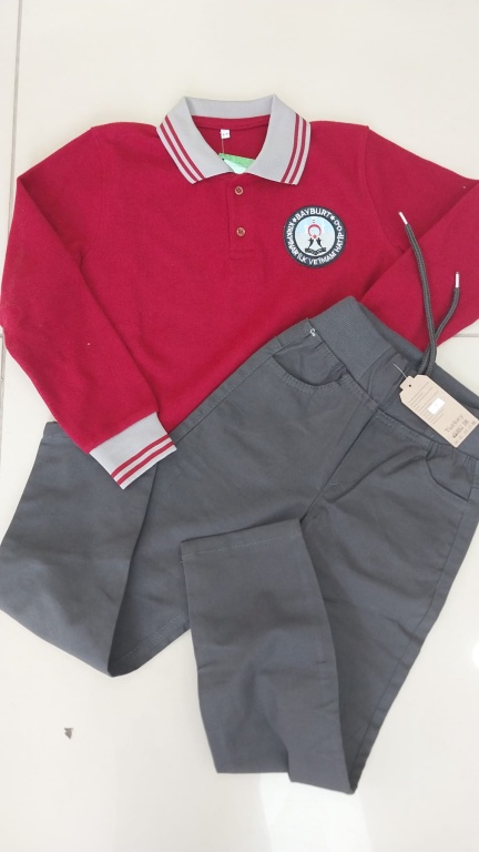 Pantolon: Beli ribanalı, kumaşı kanvas, rengi füme ( koyu gri) Sweatshirt: Selanik kumaş olup zemin rengi bordo renktir. Yaka ve kol ribana,rengi krem çift çizgi kırmızıdır.